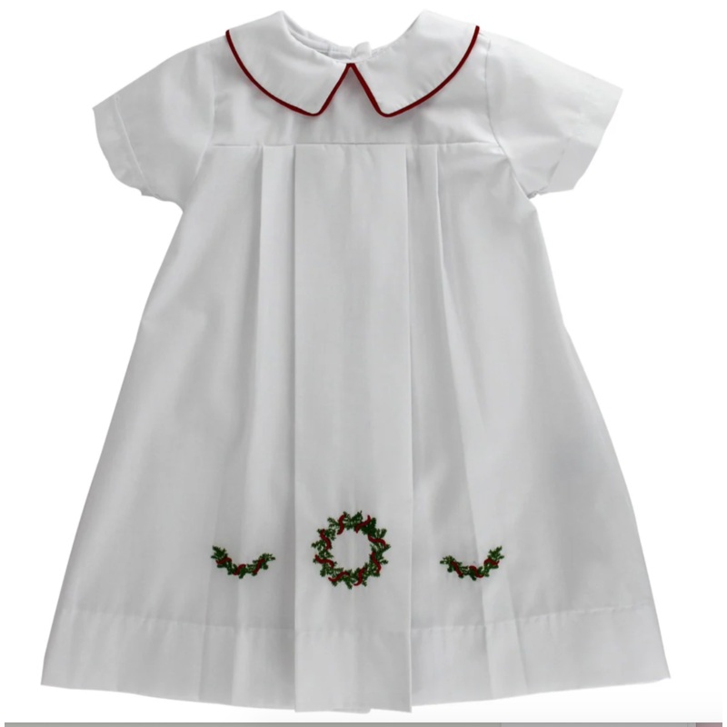 Bring classic holiday elegance to your little ones wardrobe with our White Wreath Daygown-Boy, a timeless piece designed for special seasonal moments. Made from crisp white fabric, this daygown features delicate embroidered holly wreaths and sprigs along the front hem, adding a festive and refined touch. The tailored pleats and short sleeves create a clean, traditional silhouette, while the peter pan collar with red piping adds a pop of cheerful contrast.
